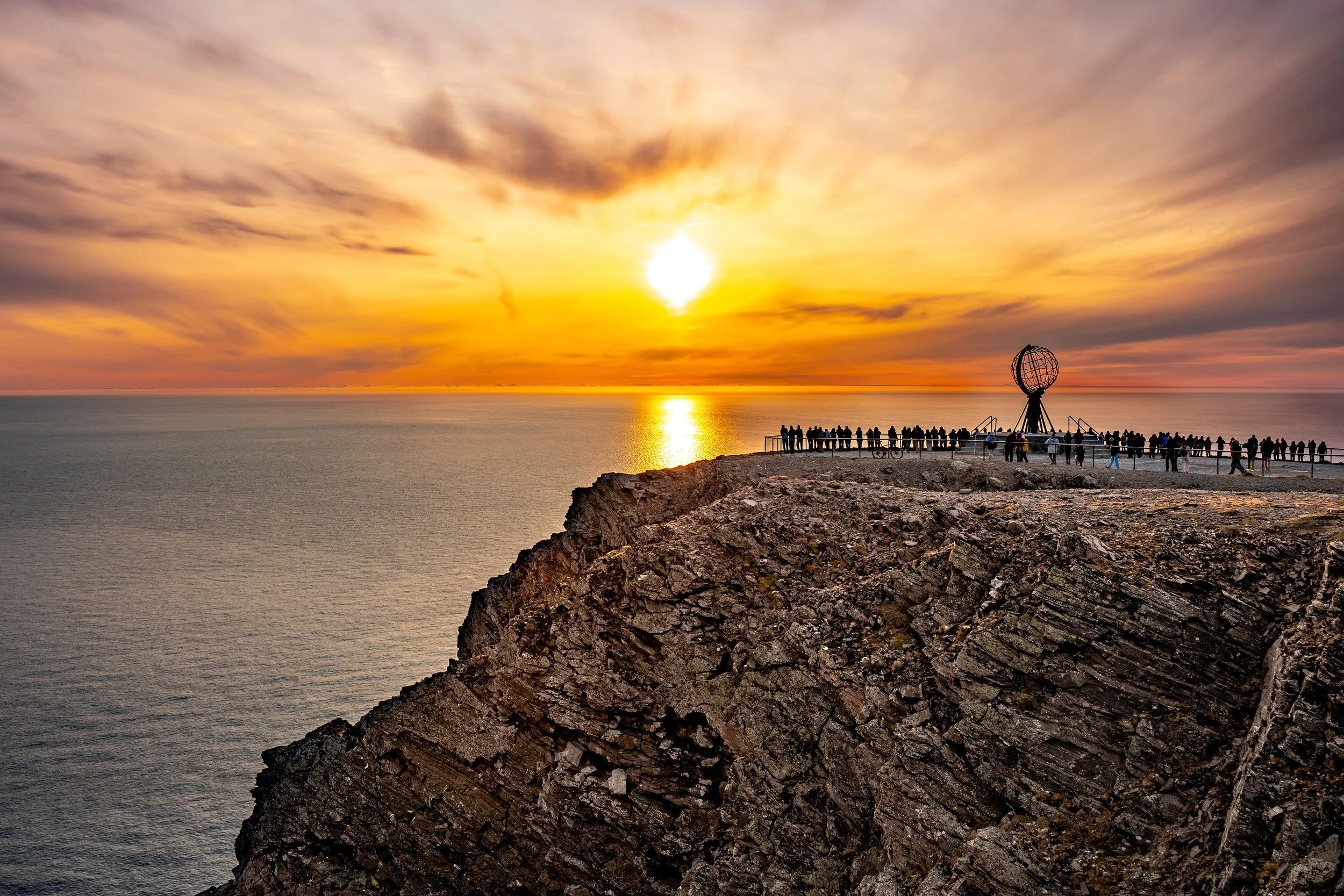Sit back and enjoy this timelapse photo as the sun sets and then rises at Nordkapp, the northernmost point of continental Europe, the North Cape of northern Norway. We took this photo over the course of several hours as we watched the Midnight Sun approach the horizon.